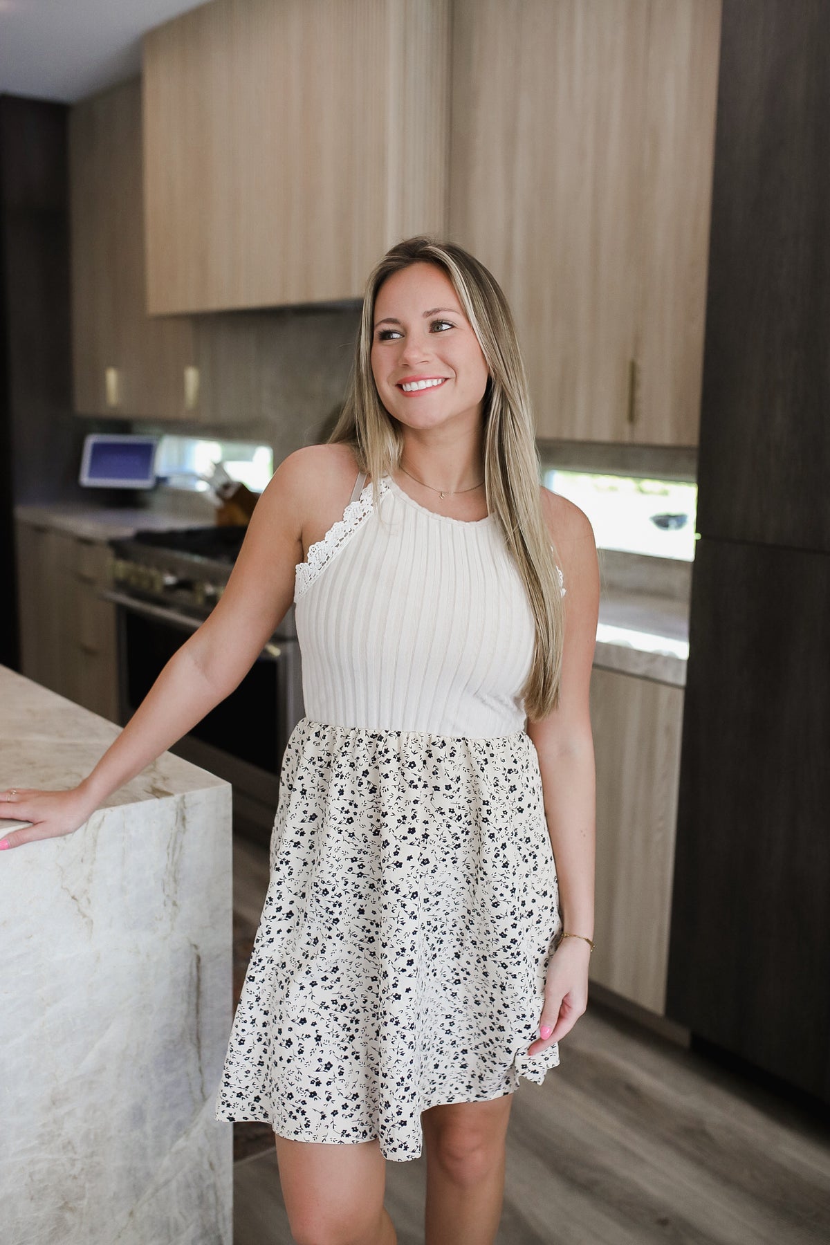 Ribbed Lace Detail Printed Sleeveless Mini Dress