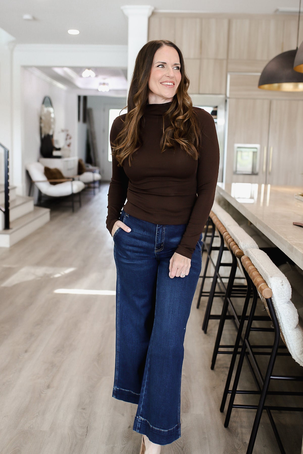 Slip into cozy charm with the Kai Long Sleeve Solid Knit Top in warm brown. Its playful mock neck and tapered hem add a flirty touch to the sleek, true-to-size fit. Crafted from lightweight knit fabric, this top moves with you, perfect for layering or wearing solo on chilly days. Embrace effortless style with a hint of whimsy!