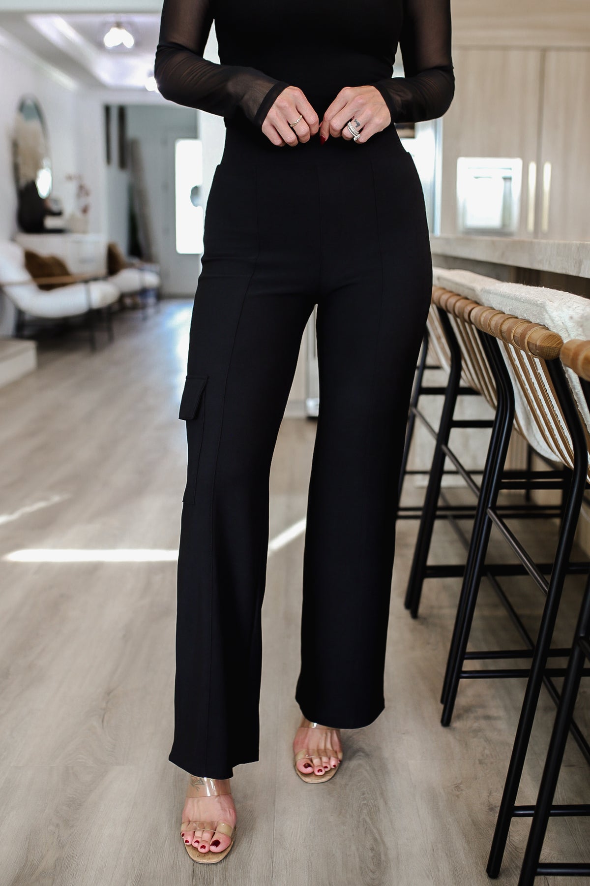 Effortlessly combine comfort and style with these high-waisted knit cargo pants. Featuring a flattering yoga-style waistband, functional side cargo pockets, and a true-to-size fit, they’re perfect for everyday wear. Crafted from a soft, lightweight knit fabric with just the right amount of stretch, these pants move with you while keeping a sleek, streamlined silhouette. The model is in the small, paired with Tina tank and Sheer Long Sleeve Knit Bodysuit. 95% polyester 5% spandex
