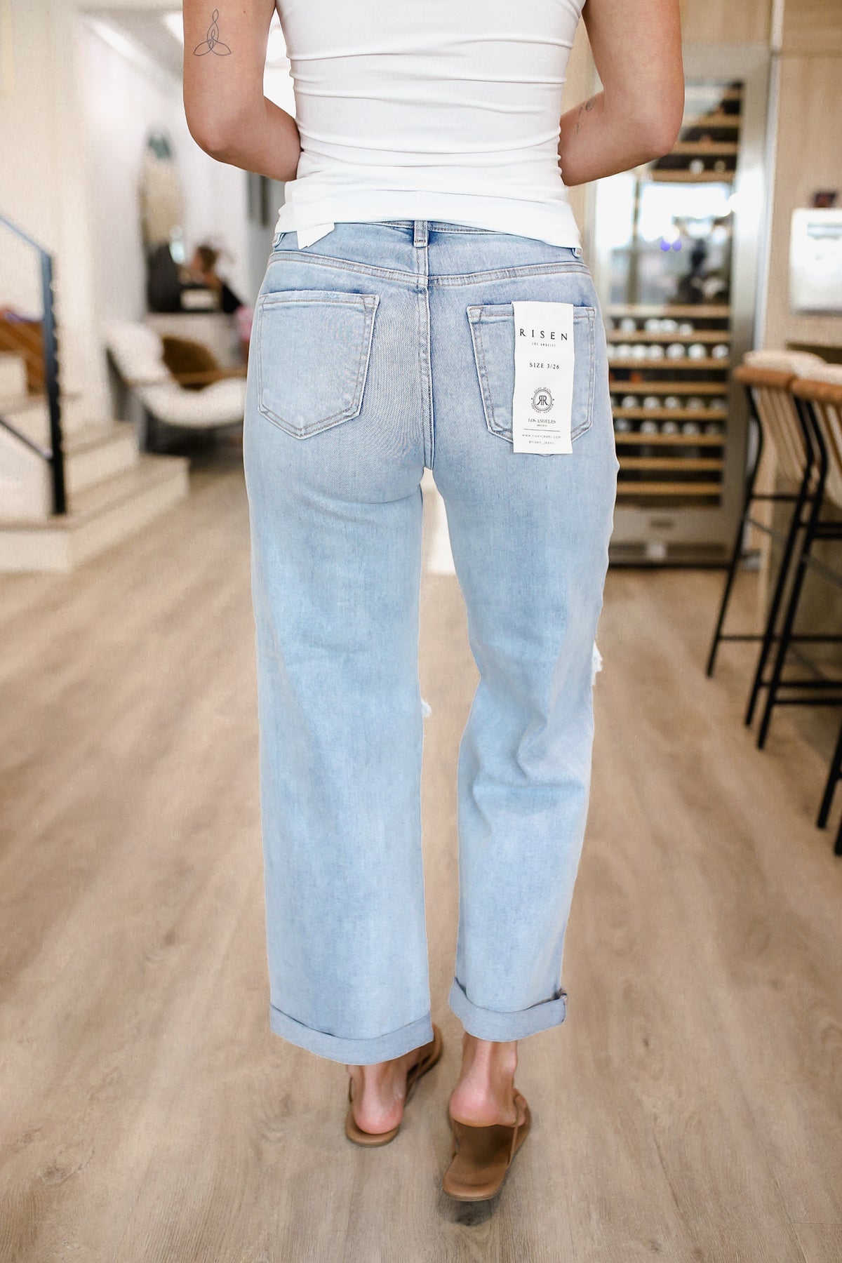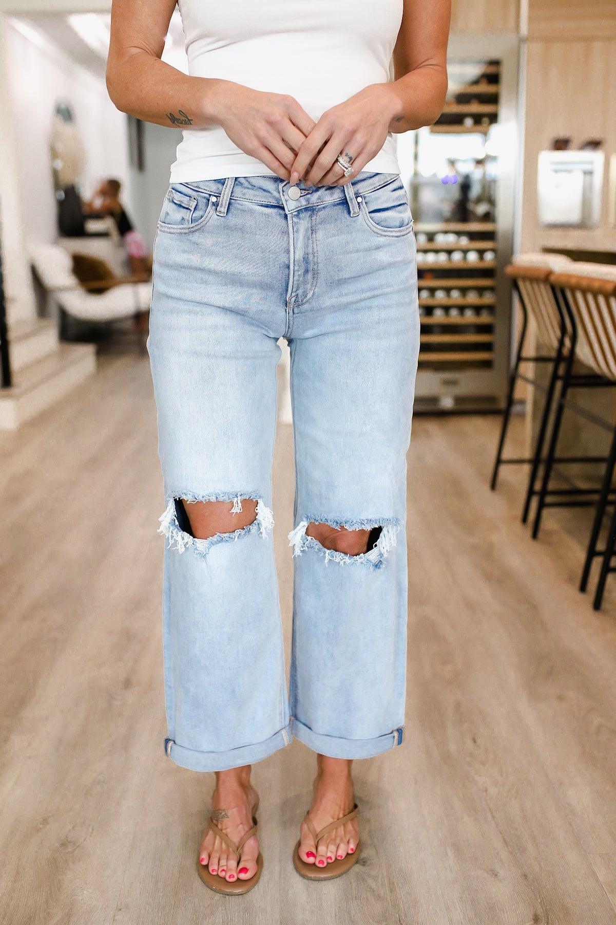 These fashion wide-leg cropped jeans feature a contemporary light wash denim construction with strategic distressing at the knees. Made from quality cotton blend denim fabric that offers both comfort and durability. The relaxed silhouette and cropped length with roll-up cuffs create a casual, laid-back aesthetic. Perfect for everyday wear with a mid-rise waist and classic 5-pocket design. The distressed details add an edgy, lived-in look while maintaining versatile styling options. The model is a 4, wearing the 3. You can size down one from your even size.