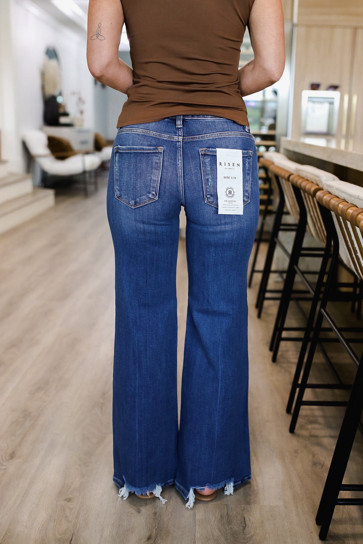 These premium wide-leg flare jeans feature a flattering high-rise waist and contemporary distressed details. Made from high-quality cotton blend denim with just the right amount of stretch for comfort. The medium wash creates a versatile look while the raw hem adds modern edge. The flared silhouette elongates the legs while maintaining a comfortable fit throughout. Perfect for casual to semi-formal occasions, these jeans combine classic styling with modern trends. The model is in the 3. You can size down one from your even size.