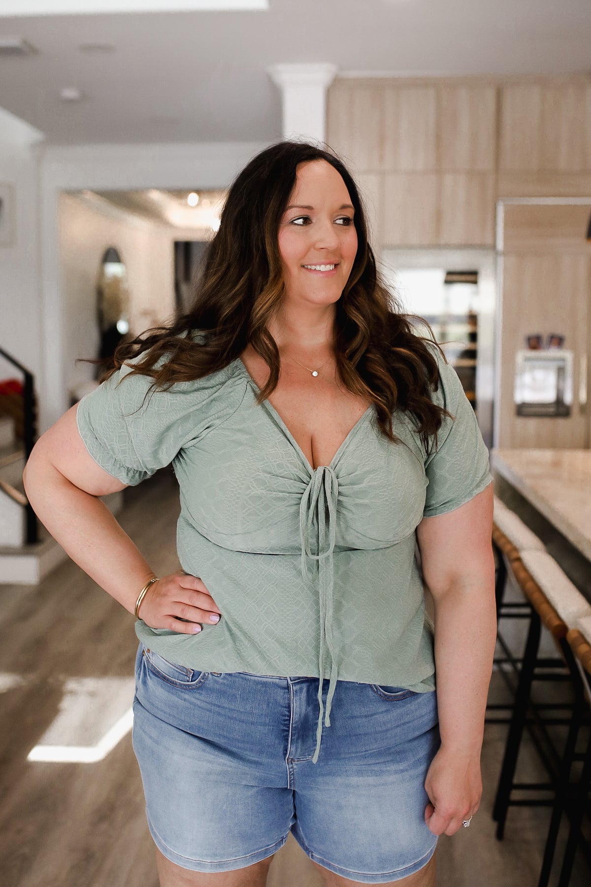 High Rise Tummy Control Denim Shorts are a fashionable and flattering option for those looking for a slimming and comfortable fit. These shorts feature a high-rise waist that sits above the natural waistline, helping to control and flatten the tummy area for a sleek and streamlined look. Made from denim fabric, they offer a classic and versatile style that can be easily dressed up or down. Whether paired with a flowy blouse for a dressier look or a casual tee for a more relaxed outfit, these shorts provide both style and functionality. The tummy control feature adds an extra level of comfort and confidence, making these shorts a must-have for your summer wardrobe. The model is a 4 wearing the medium.