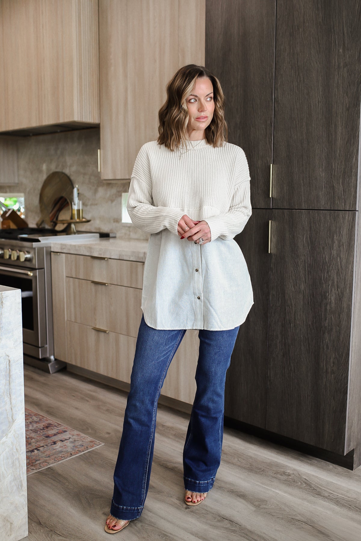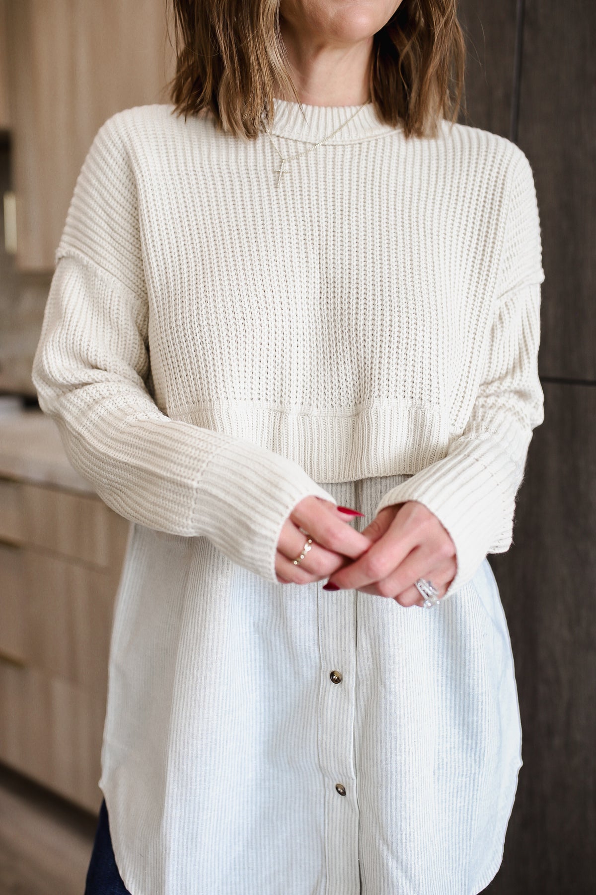 Chic meets cozy in this long sleeve half-sweater knit top. Featuring a round neck and a unique half-sweater design with a button-down body, it’s the perfect statement piece for layering or wearing on its own. Crafted from soft, lightweight 100% acrylic knit, this top offers comfort, warmth, and effortless style. The model is in the small.