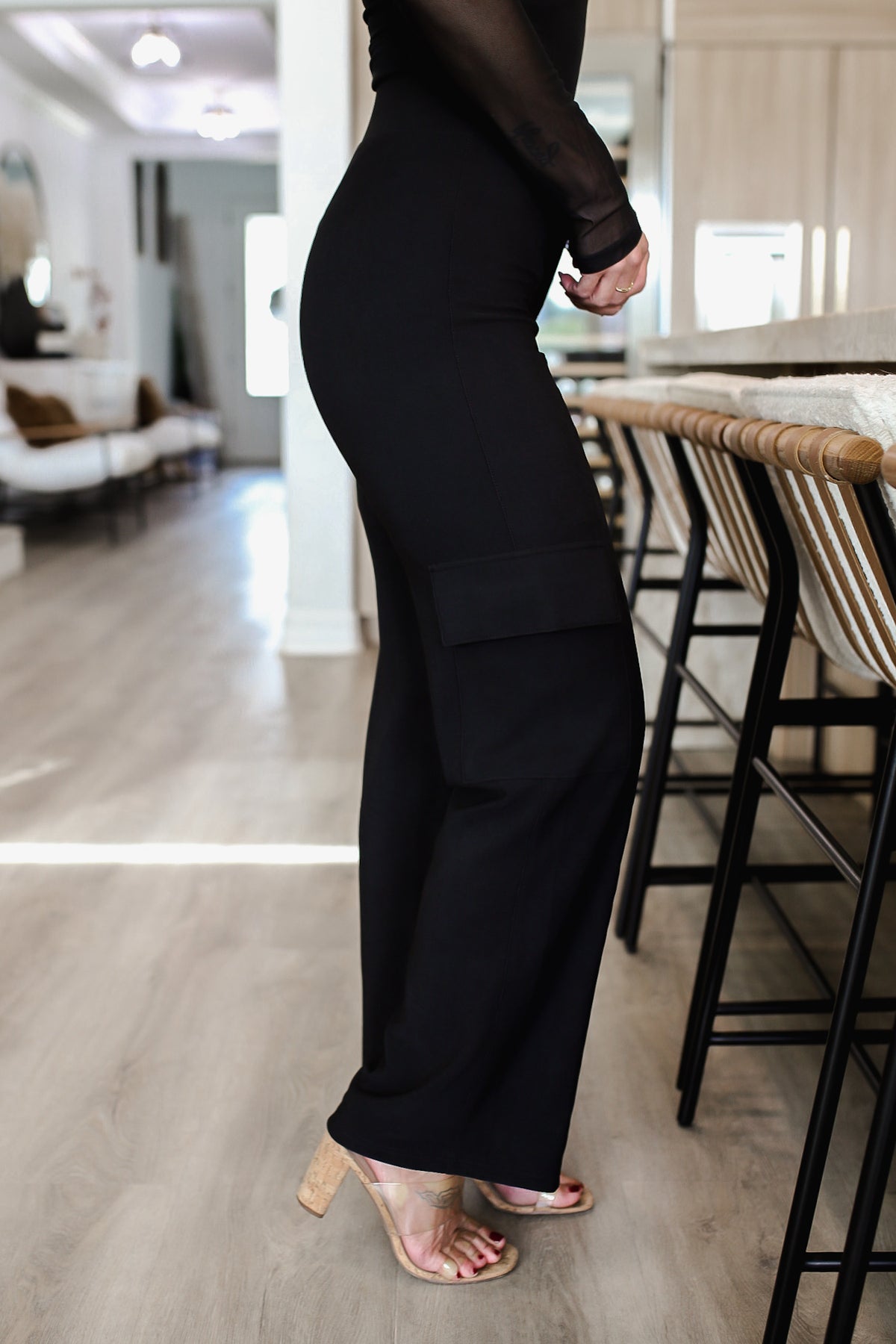 Effortlessly combine comfort and style with these high-waisted knit cargo pants. Featuring a flattering yoga-style waistband, functional side cargo pockets, and a true-to-size fit, they’re perfect for everyday wear. Crafted from a soft, lightweight knit fabric with just the right amount of stretch, these pants move with you while keeping a sleek, streamlined silhouette. The model is in the small, paired with Tina tank and Sheer Long Sleeve Knit Bodysuit. 95% polyester 5% spandex