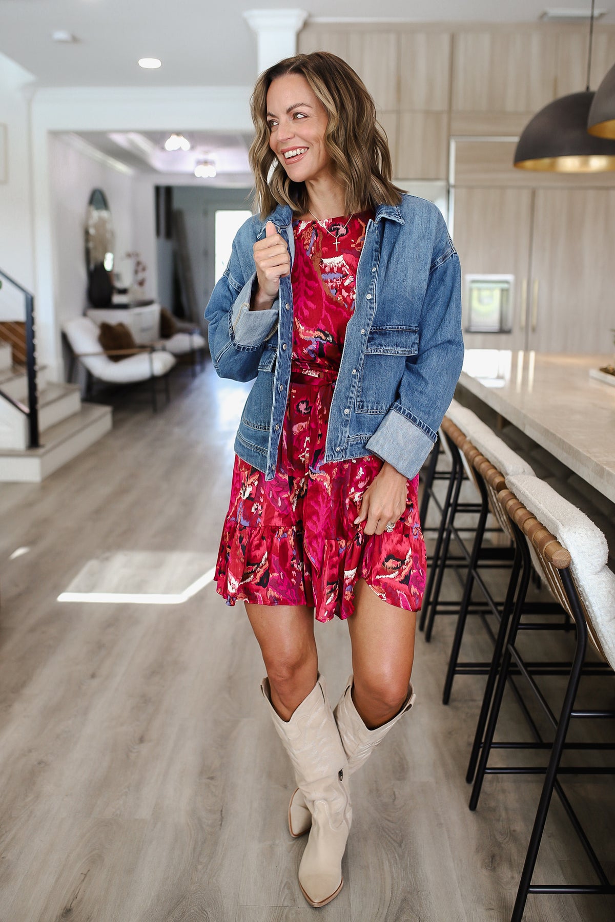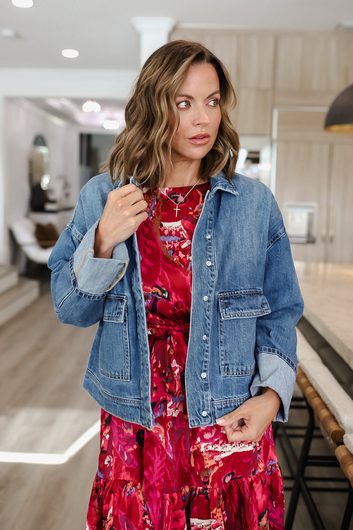 This classic blue denim jacket features an oversized silhouette crafted from premium cotton denim fabric. The vintage-inspired wash creates a lived-in aesthetic while maintaining durability. Key design elements include a traditional pointed collar, button-front closure with metal hardware, and functional chest pockets. The relaxed fit allows for comfortable layering over various tops, making it perfect for transitional seasons. The adjustable cuffs and structured shoulders provide both style and functionality. This versatile piece easily transitions from casual daywear to elevated evening looks, making it an essential wardrobe staple for any fashion-conscious individual.
