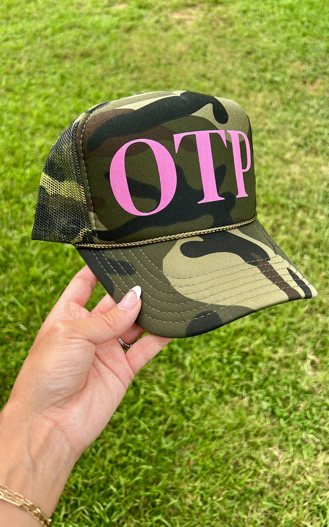Show off your OLIVEDA love in style with this camo print hat! Featuring bold pink “OTP” lettering across the front, this cap is finished with an adjustable snap-back closure for the perfect fit. A fun, everyday accessory to top off any look.