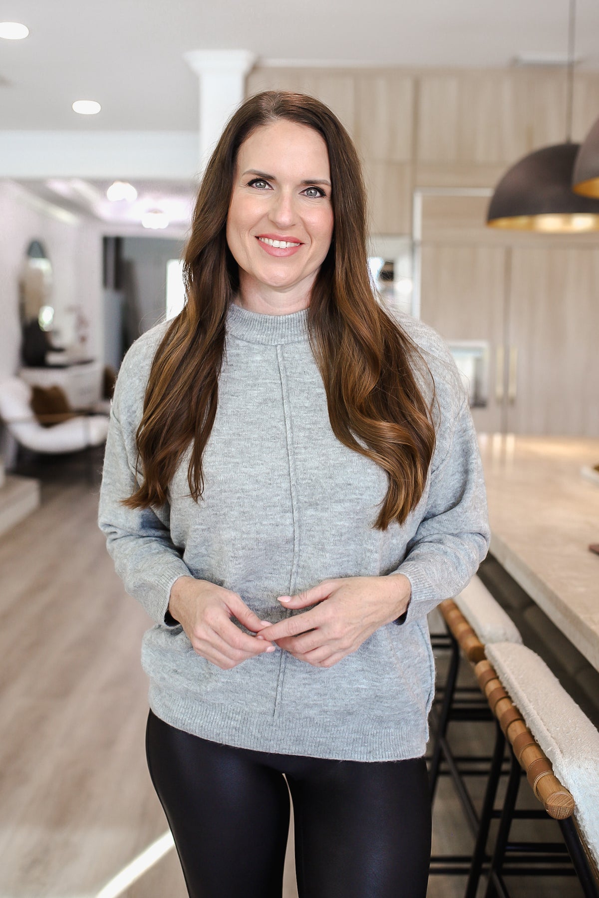 Stay cozy and stylish with this melange front seam round-neck sweater. The melange fabric adds a touch of texture and depth to this classic piece. The front seam detailing gives a subtle twist for a modern look. Perfect for layering over your favorite jeans or leggings for a casual and chic outfit.