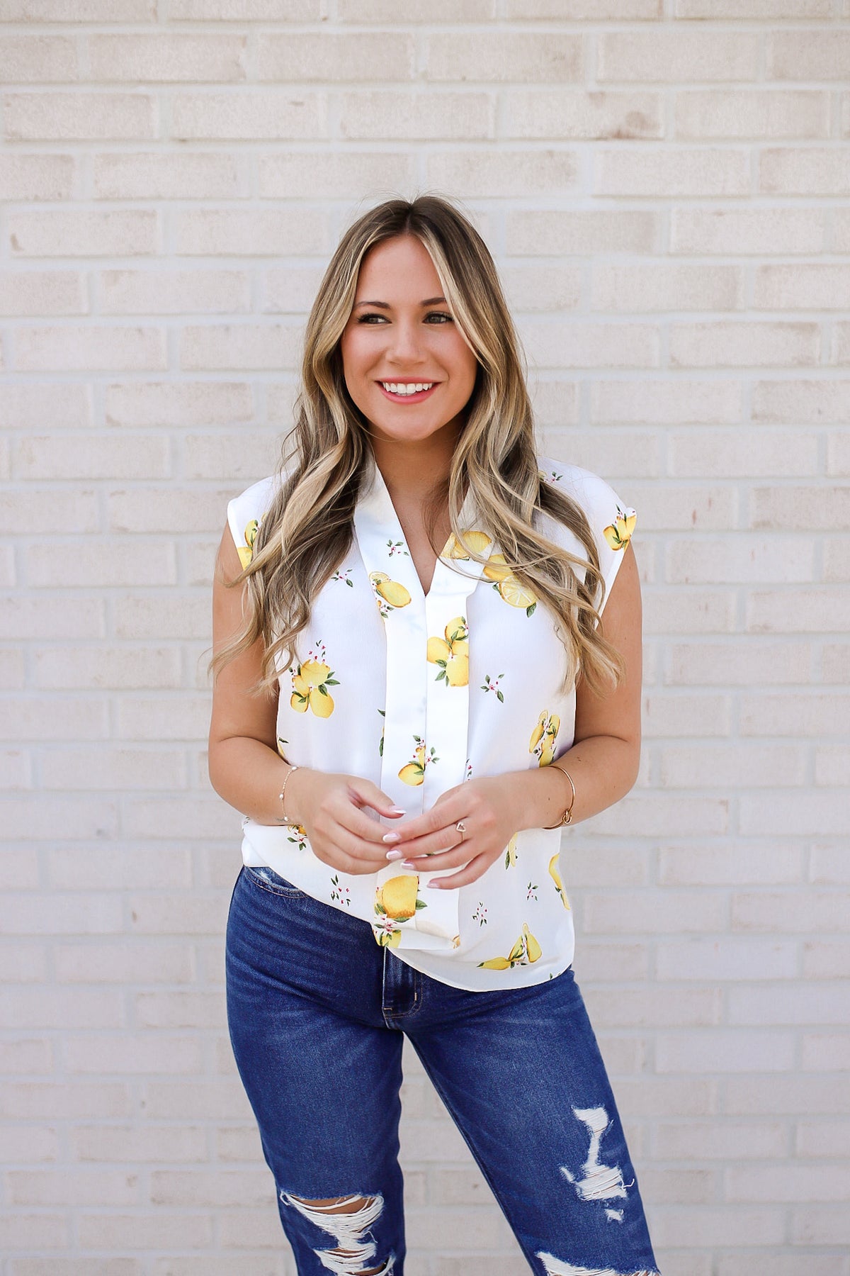 Get ready to squeeze the day in our When Life Gives You Lemons Sleeveless Blouse! This playful top features a woven fabric, a shawl collar, and a curved high low hem. Perfect for adding a touch of whimsy to any outfit whether you're working or playing.
