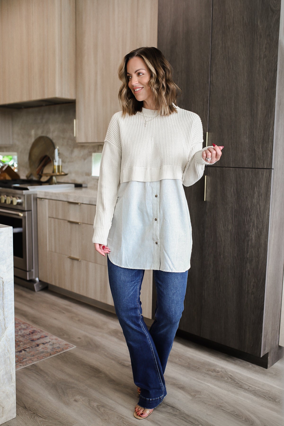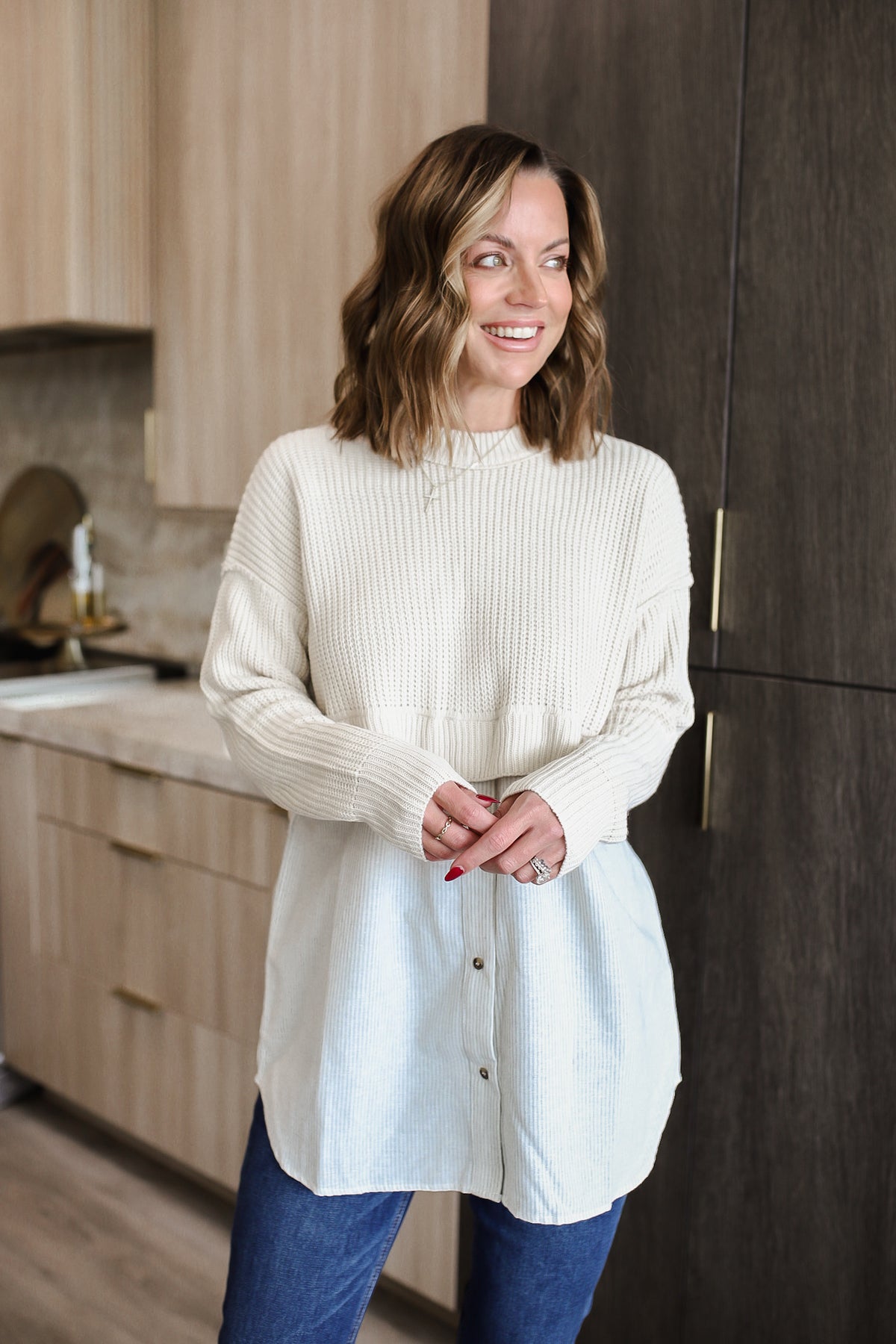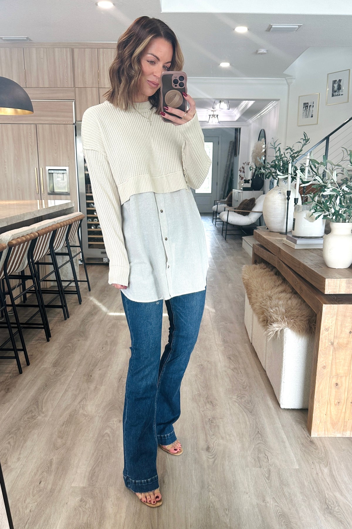 Chic meets cozy in this long sleeve half-sweater knit top. Featuring a round neck and a unique half-sweater design with a button-down body, it’s the perfect statement piece for layering or wearing on its own. Crafted from soft, lightweight 100% acrylic knit, this top offers comfort, warmth, and effortless style. The model is in the small.