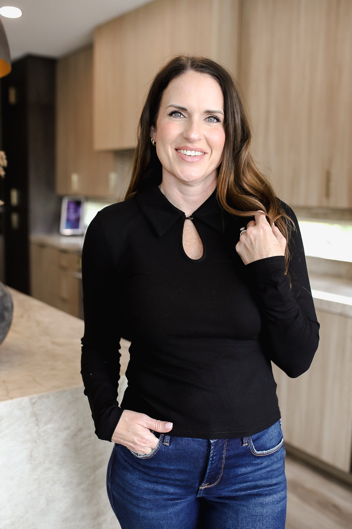 Elevate your everyday essentials with this sleek long sleeve knit top. Featuring a button loop with a chic brass button and a true-to-size fit, it’s both polished and effortless. Crafted from a soft, lightweight blend of rayon and spandex, this top offers comfortable stretch while maintaining a refined silhouette—perfect for workdays, casual outings, or layering under jackets. The model is in the small.